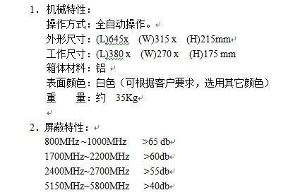 本产品为串口指令控制,测试状态显示的全自动屏蔽箱。适用于各种小型及微型通讯产品及无线产品的射频校准或耦合测试,为被测产品提供无干扰的测试环境。 * WLAN IEEE802.11A,B,G,N IEEE802.16 WIMAX测试; * GSM ,CDMA ,WCDMA, TD-CDMA, LTE手机测试; * Bluetooth, RFID, ZigBee 测试; * GPS,PDA,对讲机测试